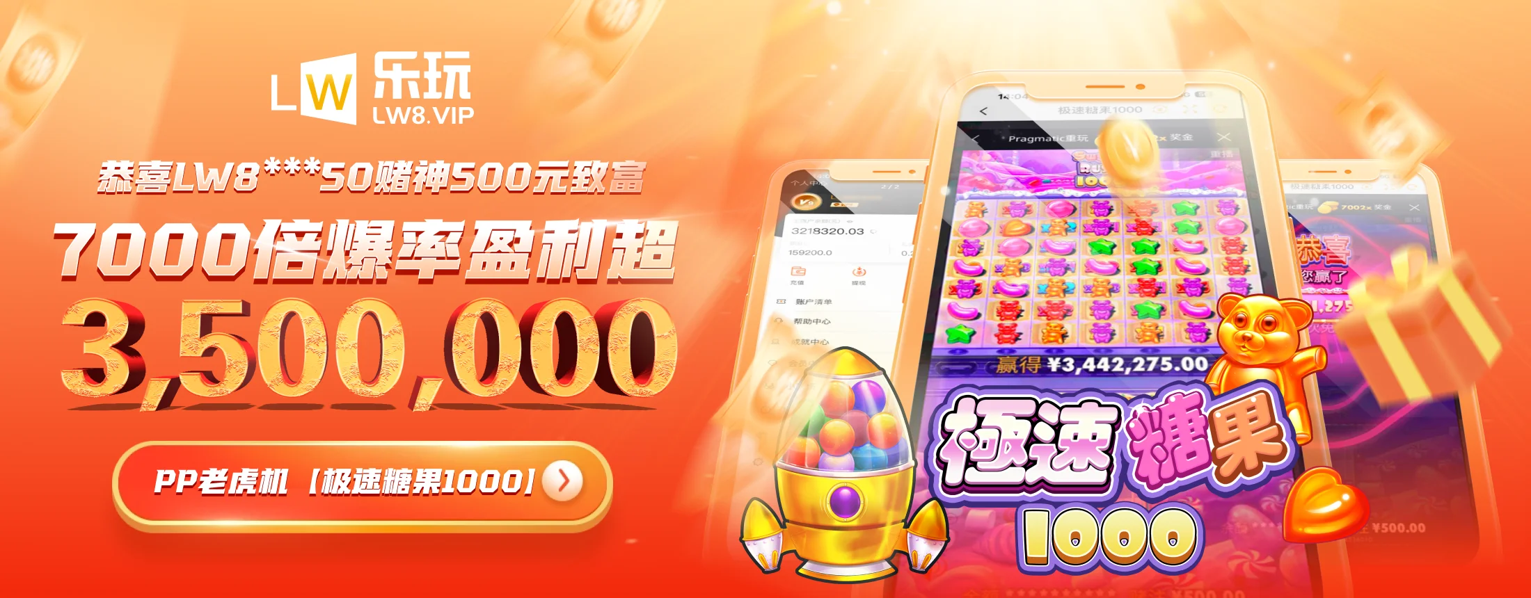 【乐玩】恭喜LW8***50在PP老虎机【极速糖果1000】爆分350万