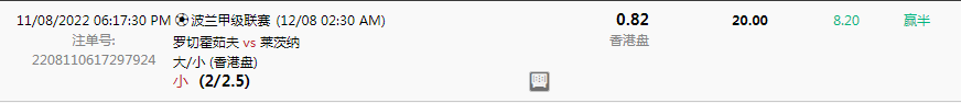 昨天的波兰甲的比赛,罗切霍茹夫 vs 莱茨纳,自己比较看好一场小球的,最终的结果是只有2个进球,自己的下注也是红了一半的,只要是能够红起来,就是很不错的。